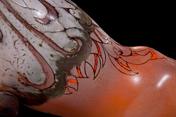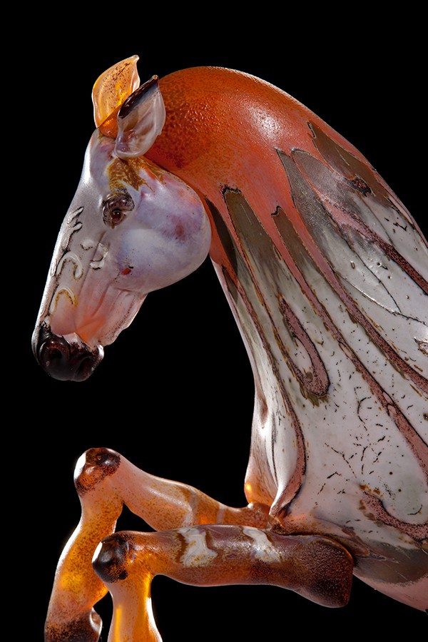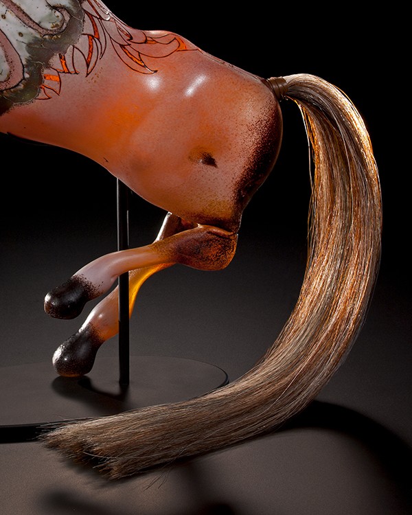 Blown, hand sculpted, and engraved glass; horse hair, steel, 22"h x 10"w x 23"d, Item No. 23373,