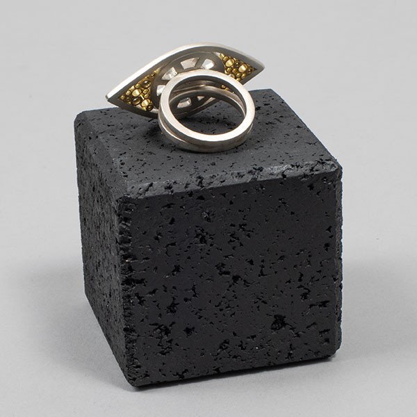 Matte finish sterling silver with 18ky gold interior and GVS white diamonds (0.12ct) Turquoise cabochon, 1"h x 1.5"w, Size 7.5, Item No. 23119,