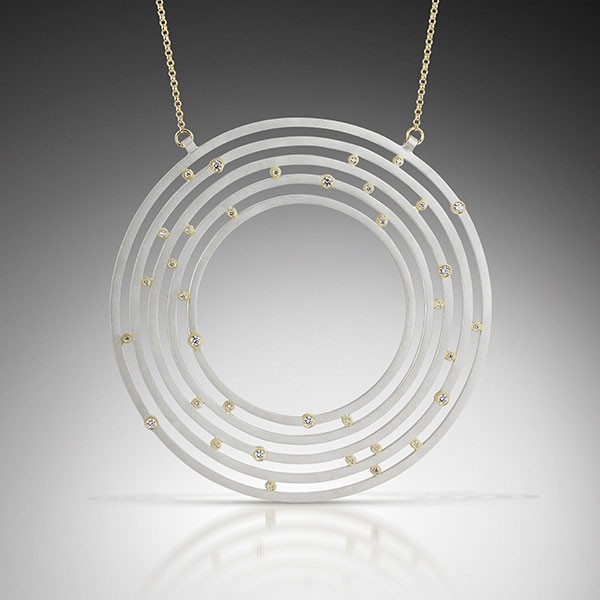 Matte finish sterling silver with 18ky gold interior and GVS white diamonds (0.53ct) 18ky gold chain and clasp, 3"dia, 20" chain, Item No. 23101,