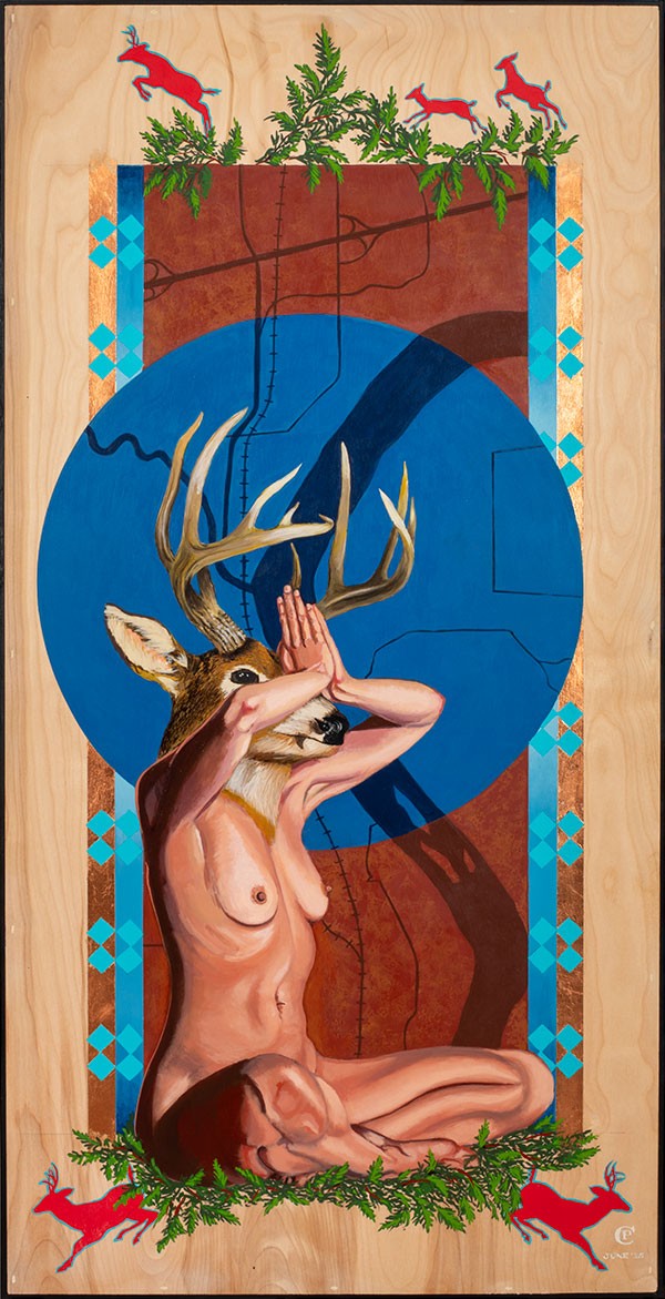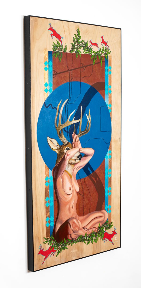 This is (or may be) the final in a series of works that are about the rematriation of Inzhuje Waxobe (Sacred Red Rock) to the Kanza people. This experience has had such a profound effect on me and my sense of community. This work features Derr Woman centering themselves and sitting on a bed of healing cedar boughs. The abstract imagery in the background is actually a contemporary map rendering of the confluence of the Kansas river and Shunganunga creek, outside of present-day Topeka. This is where Inzhuje Waxobe had lived for millennia before being uprooted and moved to Lawrence KS. The rectangle represents the grandfather rock and is surrounded by universal ribbon work designs and copper (Another healing element). The blue circle is the blue moon that occurred on the day when Grandfather came home.