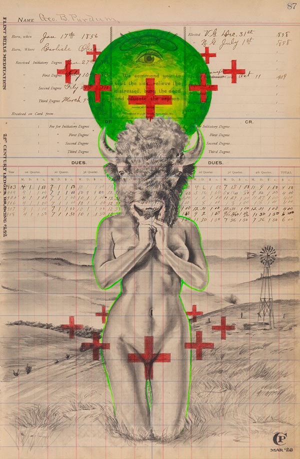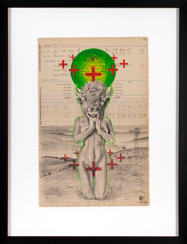 Pencil/graphite, acrylic ink and colored pencil on Odd Fellows Ledger paper, Image: 17.5"h x 11.5"w, Frame: 25.5"h x 19.5"w, Item No. 23608,
