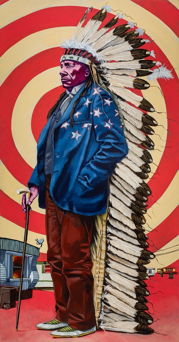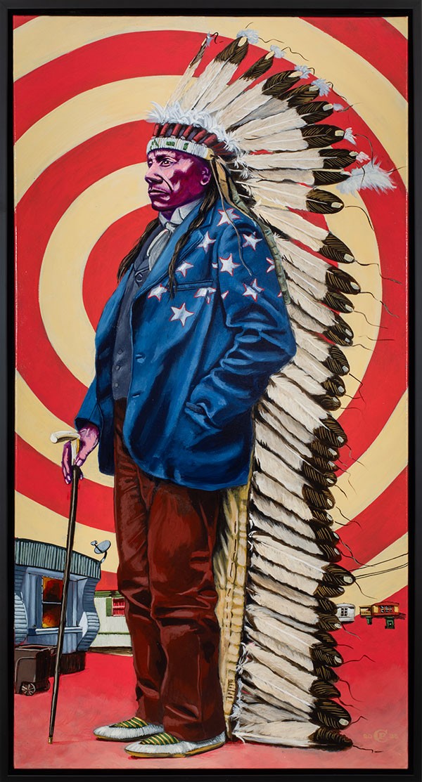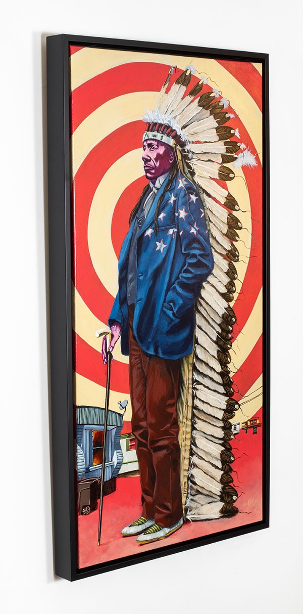 This figure in this painting came from a photograph in the National Archives as “unidentified”. I’m sure he is identified elsewhere but we will keep his anonymity here. His gesture and magnificence of the headdress appealed to me. I recently completed a painting commission for a museum and am now aiming to move my practice more into the medium of painting. In this work he represents the actions of our ancestors, yet remaining grounded and connected to community. He is/was not afraid to do what was needed to be on the right side of history.
