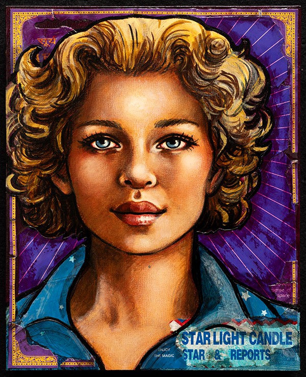 I have long been blown away by the portraiture of Marlene Dumas. Deceptively simple and spare, it packs a punch that is unforgettable. I wanted to celebrate her in that same spirit: with minimal trash (Indian incense packaging; sparkling water ephemera; a candy wrapper); in her palette- of vivid yellows, deep violet, and sky blue; and with a composition she frequently utilizes: head on and looking the viewer straight in the eyes.