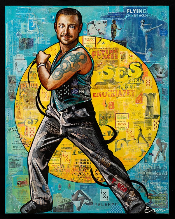 Jaimes has been instrumental in my own ongoing development as a tango dancer; as well as my close longtime friend. In my homage to him, I have included tango flyers from Sicily, Buenos Aires, Dallas, Mexico, & Taos; stocking, pantyhose, mens briefs, & lingerie packaging; 8 of hearts playing cards; a bialetti box; an extreme twist collision repair business card; pages from an Italian porn comic that used Carlos Gardel as its primary character; an Istanbul milonga ticket; & so much more!