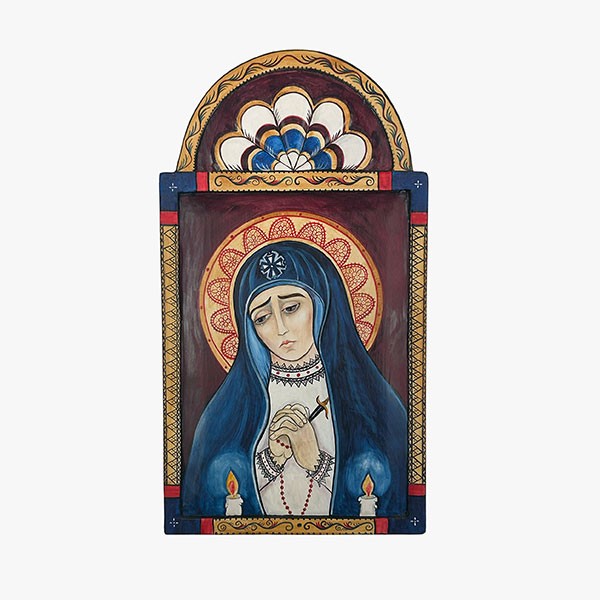 Retablo; carved wood with pigments, 19”h x 10.5”w, Item No. 22898,