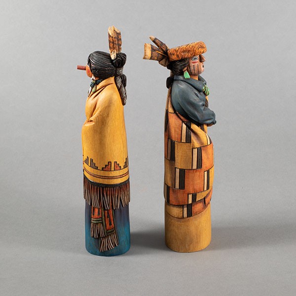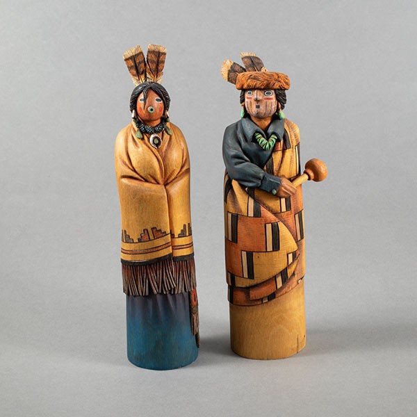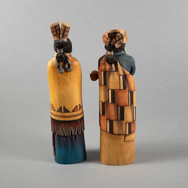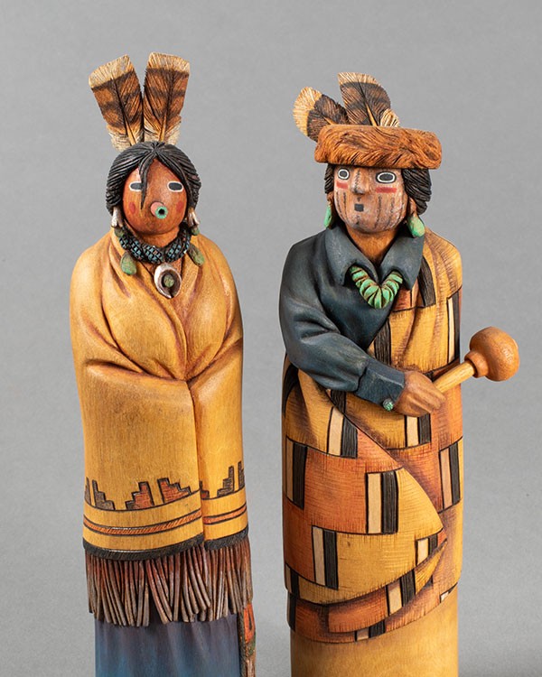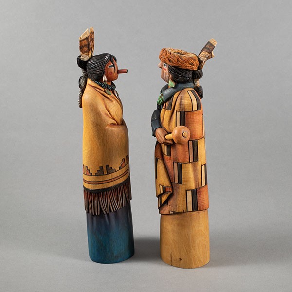Carved cottonwood root with pigments, Man: 8.5”h x 3”w x 2.5”d Woman: 8.75”h x 2.25”w x 2.25”d, Item No. 22971,