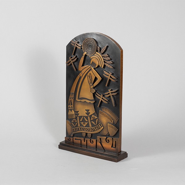 “One thing I appreciated right away about bronze is the strength, the durability—a very different quality than clay,” states Garcia. “I’ve also been able to produce many levels of relief. With this piece, there’s a feeling of depth in which you clearly see the three dimensions, especially in the basket that the rain dancer is holding.”