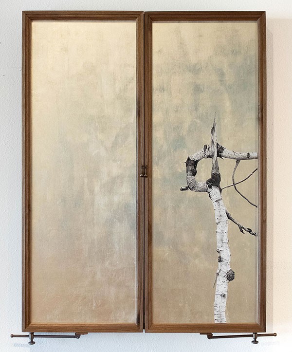 Ink painting on panel, gold leaf, walnut, 50"H x 76"W, Item No. 23349,