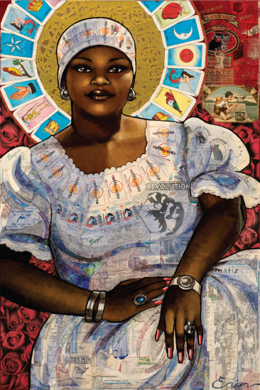 Erin Currier sees beauty in all people, everywhere in the world, and she depicts this beauty in her art as a means of confronting injustice, oppression, and prejudice in all their forms. You won’t find evidence of outrage or despair in her collaged portraits, though, despite the strong political subtexts that animate them; instead you’ll witness luminous spirituality and the complexity born of simplicity in the lives of ordinary people.
