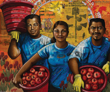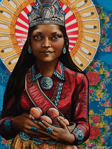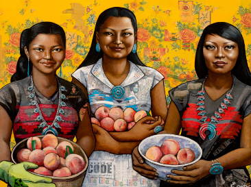 In her latest series, “The Orchard Keepers,” Currier’s subjects wear beatific smiles and are framed by mandala-like shapes reminiscent of Buddhist thangka paintings, underscoring the sacred nature of the human condition even in the humblest of circumstances. “All of my work is about the human spirit,” she says, citing the struggles of women, workers, activists, and peasants against persecution around the world.