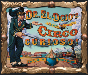 Dr. El Ocio and his circus invade and astonish the townspeople, and then Dr. El Ocio vanishes in the thick of night. The artist elaborates, “every good showman knows when it’s time to roll out of town (with the lights off).” At just over six feet tall (framed), Dr. El Ocio’s Exit documents this dramatic goodbye in a cinematic portrayal of the smarmy, one-eyed, ringmaster proudly heading a locomotive bustling straight out of town and straight for us! He hangs on with one oversized grip while the other hand victoriously waves his magician’s wand overhead, narrowly escaping the swirling storm clouds behind that allude to some metaphoric uproar. A shooting star dives aside the doc’s towering contrapposto- a cosmic sign that’s as ephemeral as Dr. El Ocio himself. Constantly siting the New Mexico landscape, Vogel references a nearby canyon where the narrow gauge railroad ran. Depicted here in the background, the canyon harbors the lonely giant who stayed behind. Dr. El Ocio’s Circo Curioso isn’t all make-believe and a certain top hat at Blue Rain Gallery lingers as evidence.