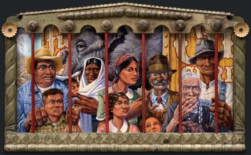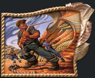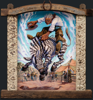 The circus attracts a diverse group of characters including the local Nortenyos, who gather to see a giant striped cat (a.k.a a tiger). We don’t see the cat but we do see what the onlookers miss: the enormous pachyderm sneaking out of the train car right behind them. Another work shows Juan De Dios Gallegos, the best cowboy in Northern New Mexico, who catches air on his zebra as it bucks up under a crisp blue sky. At sundown, the Aztec fire masters blow flames while Vidal, an enchanted youngster, stares up at their brazen confidence. According to Vogel, no circus is complete without a flying man, painted here on an arched support and framed by an actual antique birdcage. Also in the mix: Our Lady of Perpetual Tattoos, the roustabouts, gypsy performers enjoying down time, and a myriad of other curiosities best seen to believe.