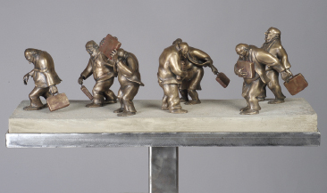 Another fascinating piece is Spei’s “Seven.” At first glance, one could observe seven individuals holding briefcases walking in what appears to be a busy scene. Upon closer inspection, it is clear that each of these characters are walking against the wind, or as Spei put it, “against the force of nature.” Also, each figure is barefoot upon a monolith, representing the idea that, “although we do all these things to feel bigger and better, we are still animals marching atop a manmade structure.”
