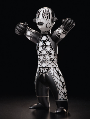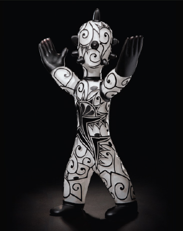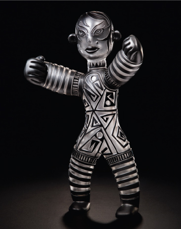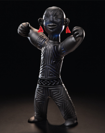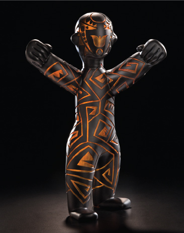 The figures evince characteristics reminiscent not just of superheroes but also of space aliens, pan-Native designs like Polynesian tikis, masked warriors, and traditional Native symbols, combining the sculptural qualities of the clay with the luminous appeal and permanence of the glass while blending traditional forms with contemporary sensibilities.