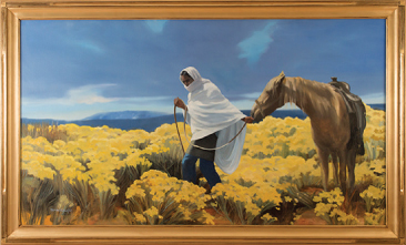 Many of Roseta Santiago’s paintings offer a nostalgic presence full of symbolism and storytelling beyond what words can express. The piece entitled, “A Place Where I Have Been” portrays the wanderings of a man draped in a penny blanket walking with his horse, and surrounded by bright-yellow Chamisa wildflowers with the Sangre de Cristo Mountains peeking over in the distance. Santiago describes this piece as being, “reminiscent of how we feel when we’re in a place we’ve been before.”