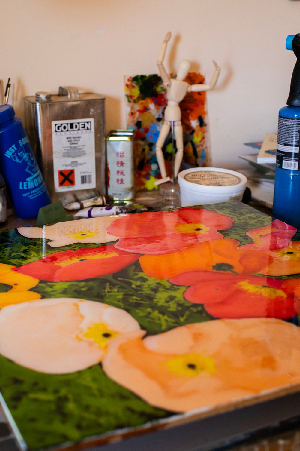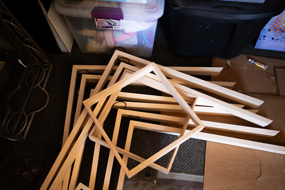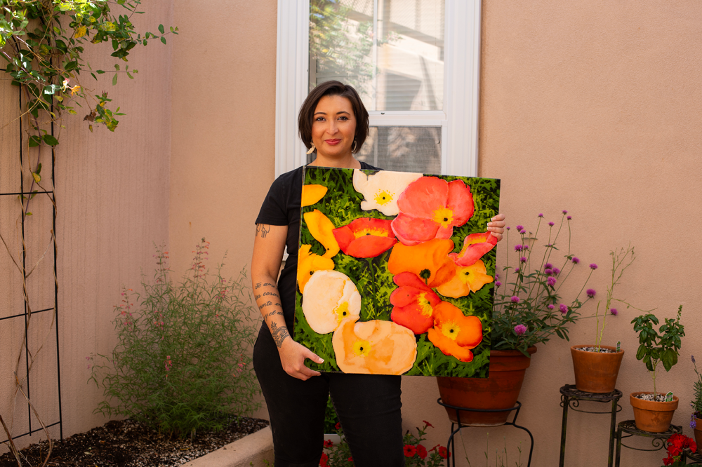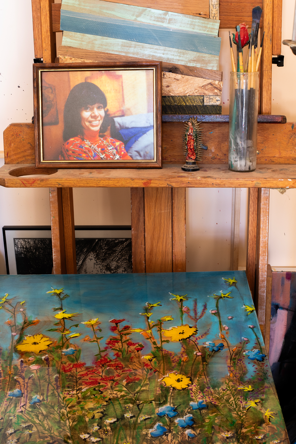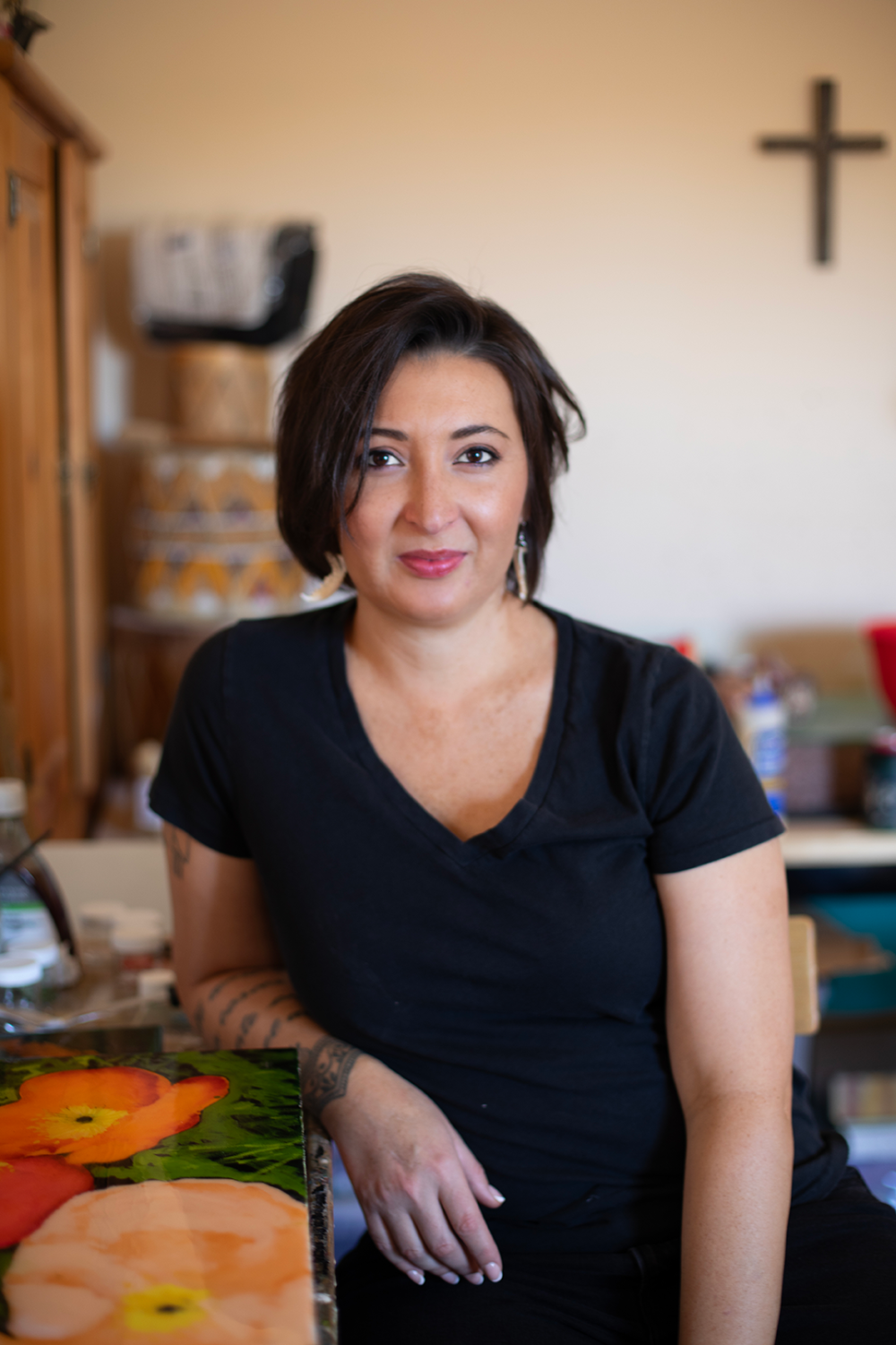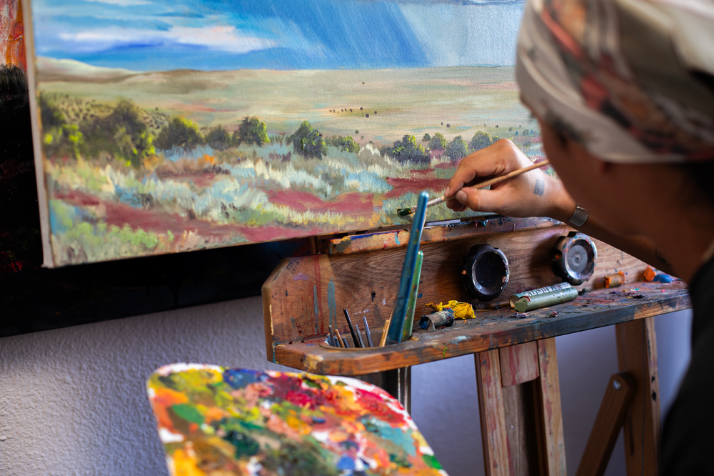 Helen draws strength and inspiration from her maternal heritage from Santa Clara Pueblo, which informs the spiritual undertones of her work. Raised in an artistic household, she also credits her father, a professional framer, with instilling in her a deep appreciation for craft. In a rare blending of roles, Helen builds and frames her own canvases, a practice that reflects her holistic approach to making art: grounded, thoughtful, and wholly her own.
