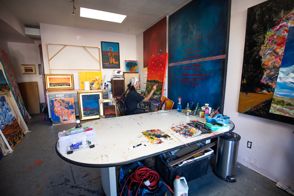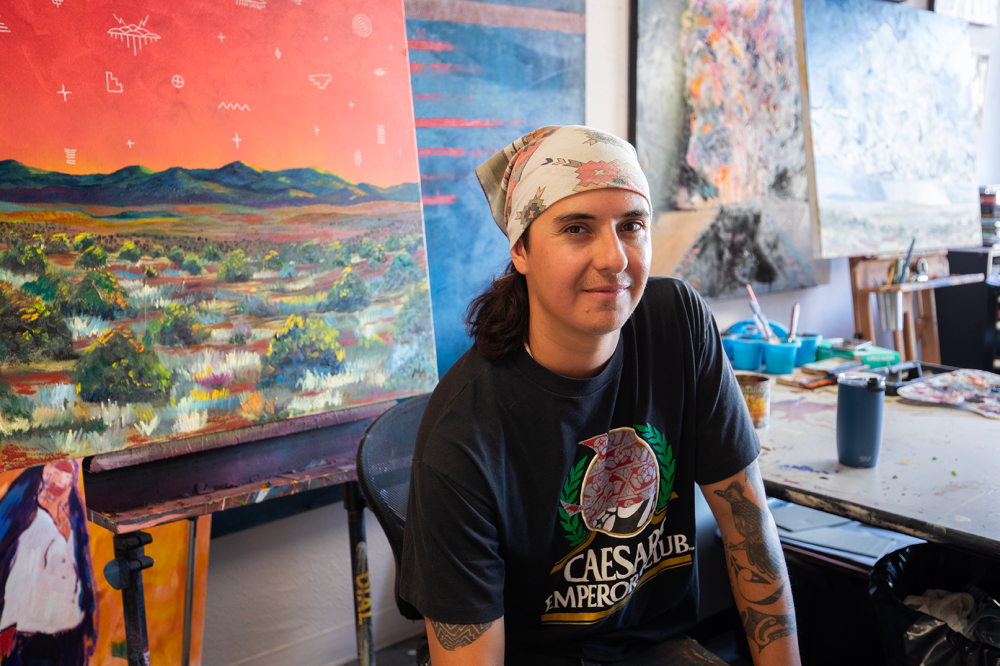 Jesse Littlebird, a multidisciplinary artist of Laguna and Kewa Pueblo heritage, continues to expand the reach of contemporary Indigenous art through his bold, abstract expressionist paintings. His latest works explore themes of ancestral memory, place, and personal identity, rendered through vibrant layers of color and mark-making that pulse with emotional resonance. In his studio, Jesse shared how storytelling remains central to his practice, each piece an intimate yet expansive reflection on culture, tension, and transformation.