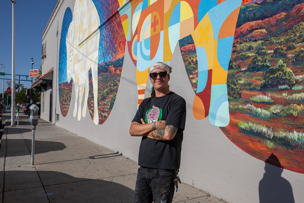 In addition to his studio work, Jesse is making a powerful impact in the public sphere. His most recent project is a large-scale mural located at Central Avenue and 5th Street in downtown Albuquerque. Commissioned by the City of Albuquerque and created in collaboration with another local artist, the mural is a striking tribute to Native presence in urban space. It bridges the gap between traditional storytelling and public engagement, bringing cultural symbolism to the heart of the city.